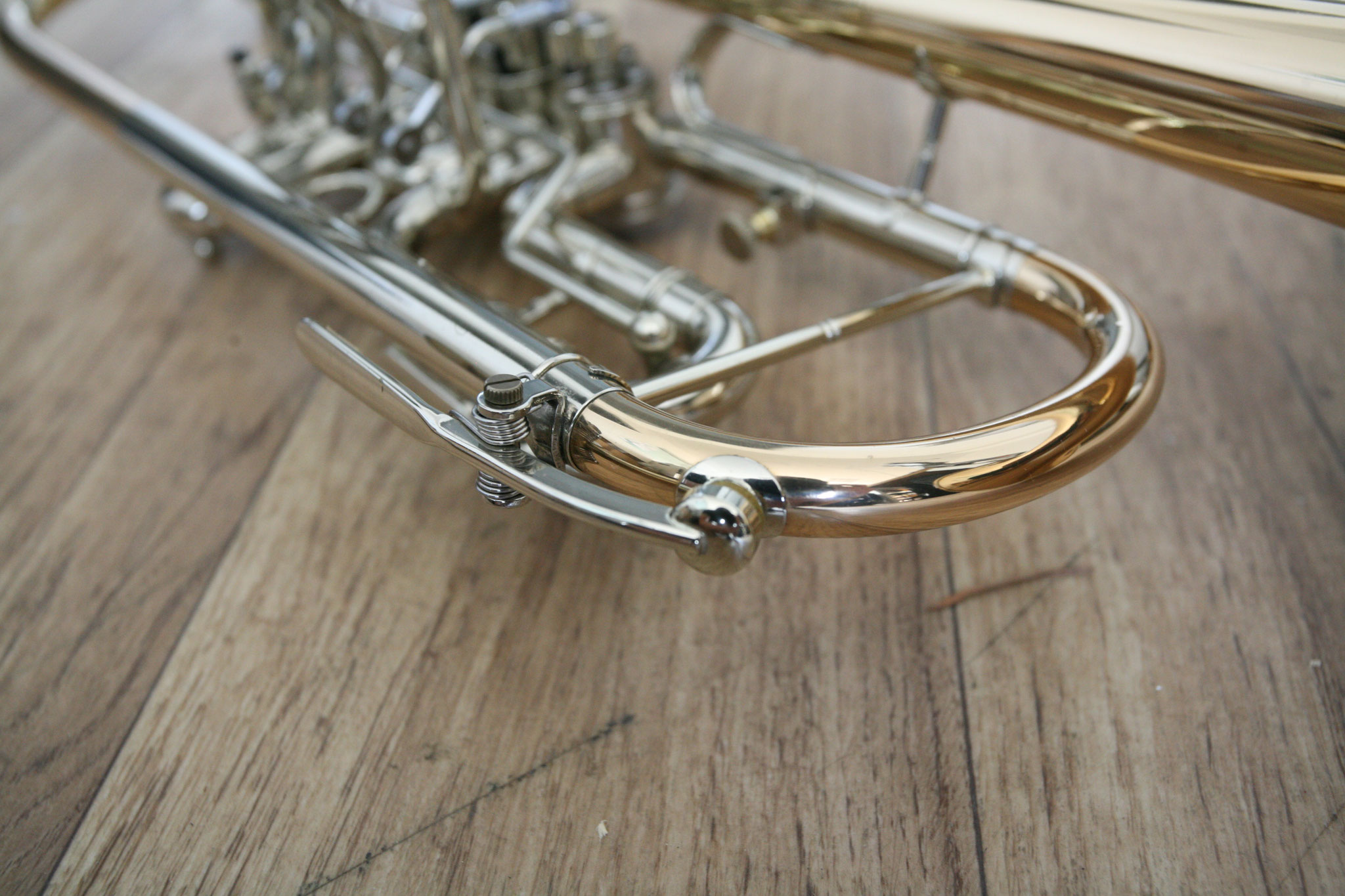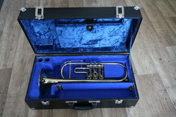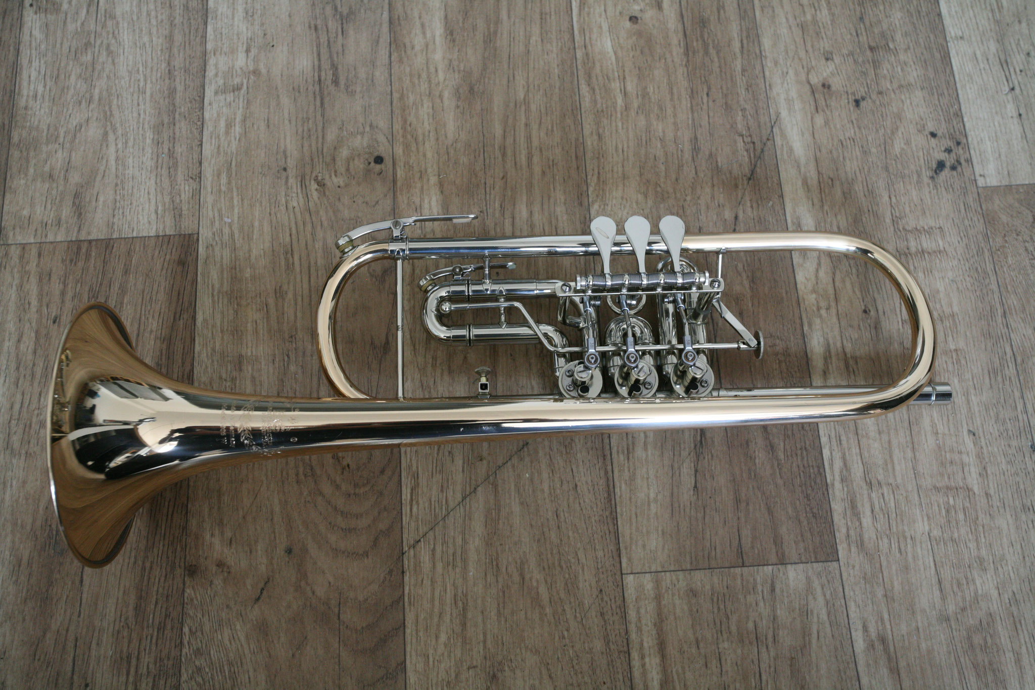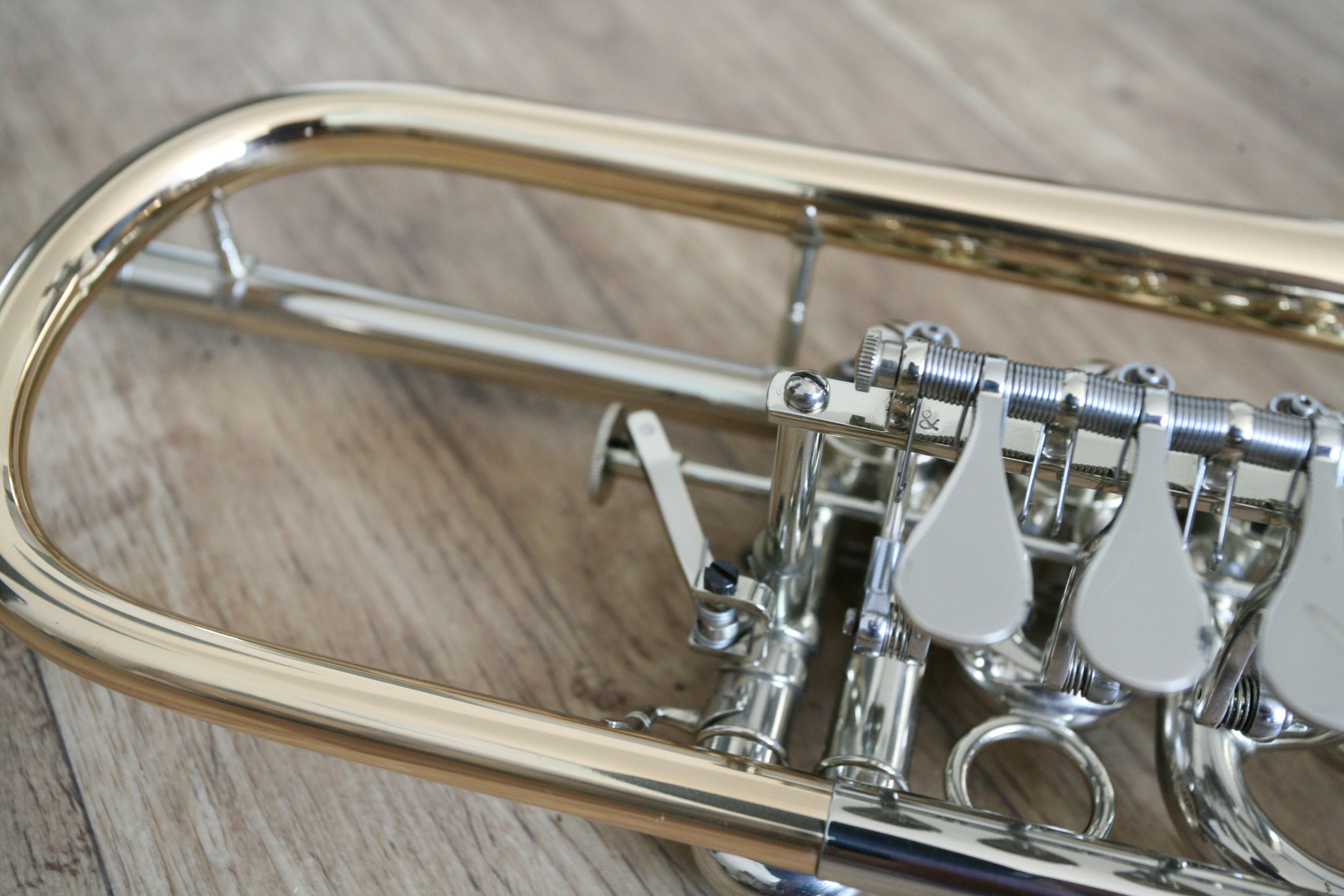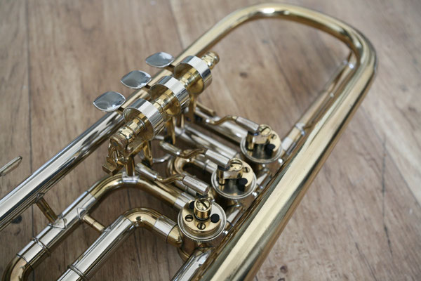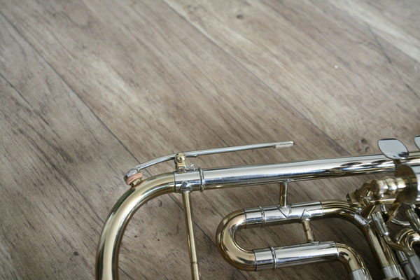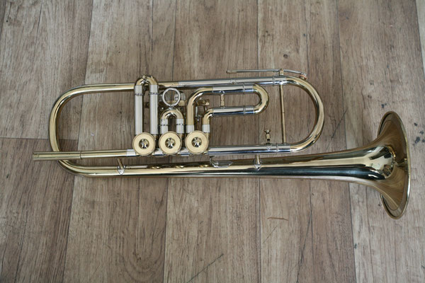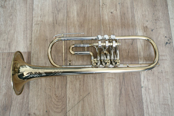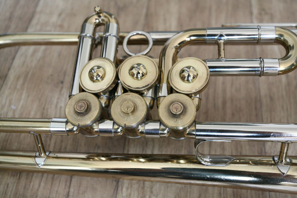 Dieses Instrument ist neu gekauft worden, entlackt, Maschinen-Block rausgelötet und mit einem neuen Maschinen-Block von Meinlschmidt mit MAW-Ventilen getauscht worden. Alles Teile sind original geblieben. Lediglich eine Stütze musste ich länger nachbauen und die Schall- & Mundrohrstütze verbreitern, da die Maße leider nicht gleich zum original Ventilblock waren. Das alles ist nur durch einen Kundenauftrag entstanden, da der original Ventilblock für den Neubau einer Neuen Trompete verwendet wurde. Um die Trompete weiterleben zu lassen, entschied ich mich für diesen Umbau.
