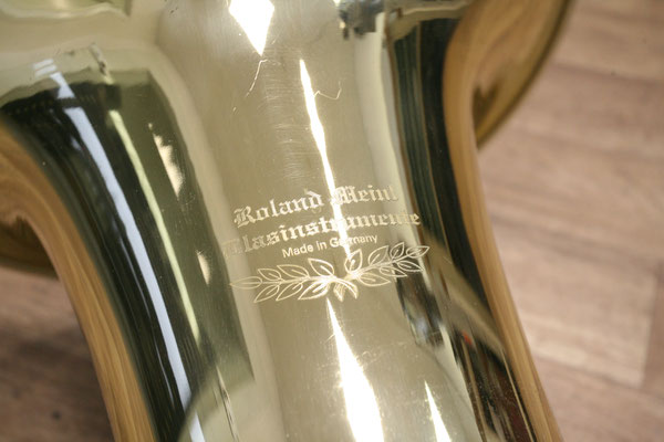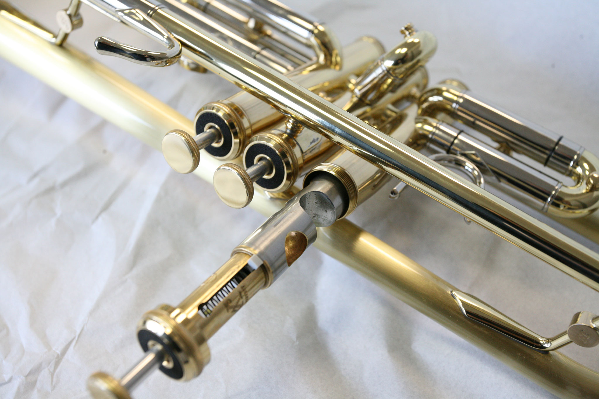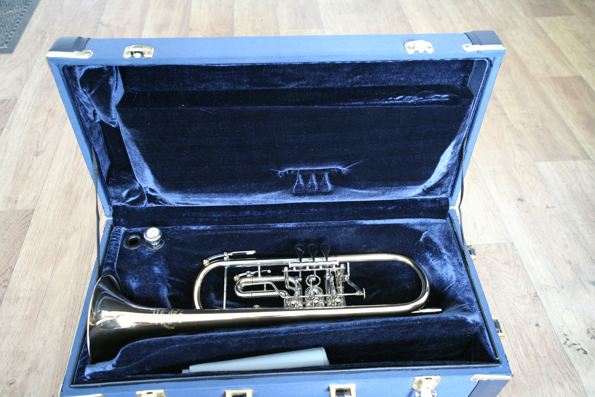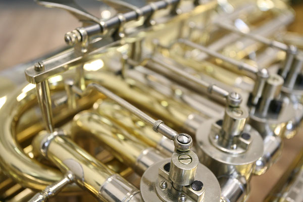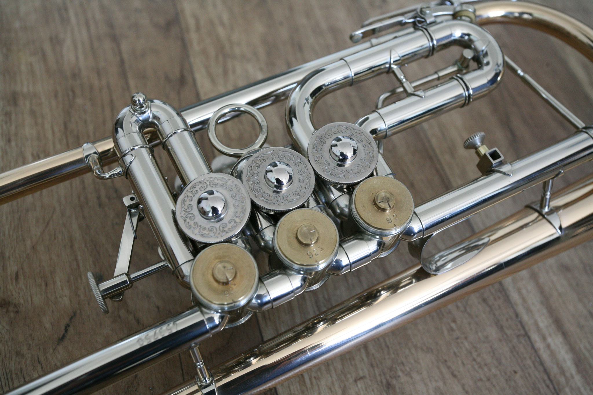 Dieses Instrument ist neu gekauft worden, entlackt, Maschinen-Block rausgelötet und mit einem neuen Maschinen-Block von Meinlschmidt mit MAW-Ventilen getauscht worden. Alles Teile sind original geblieben. Lediglich eine Stütze musste ich länger nachbauen und die Schall- & Mundrohrstütze verbreitern, da die Maße leider nicht gleich zum original Ventilblock waren. Das alles ist nur durch einen Kundenauftrag entstanden, da der original Ventilblock für den Neubau einer Neuen Trompete verwendet wurde. Um die Trompete weiterleben zu lassen, entschied ich mich für diesen Umbau.