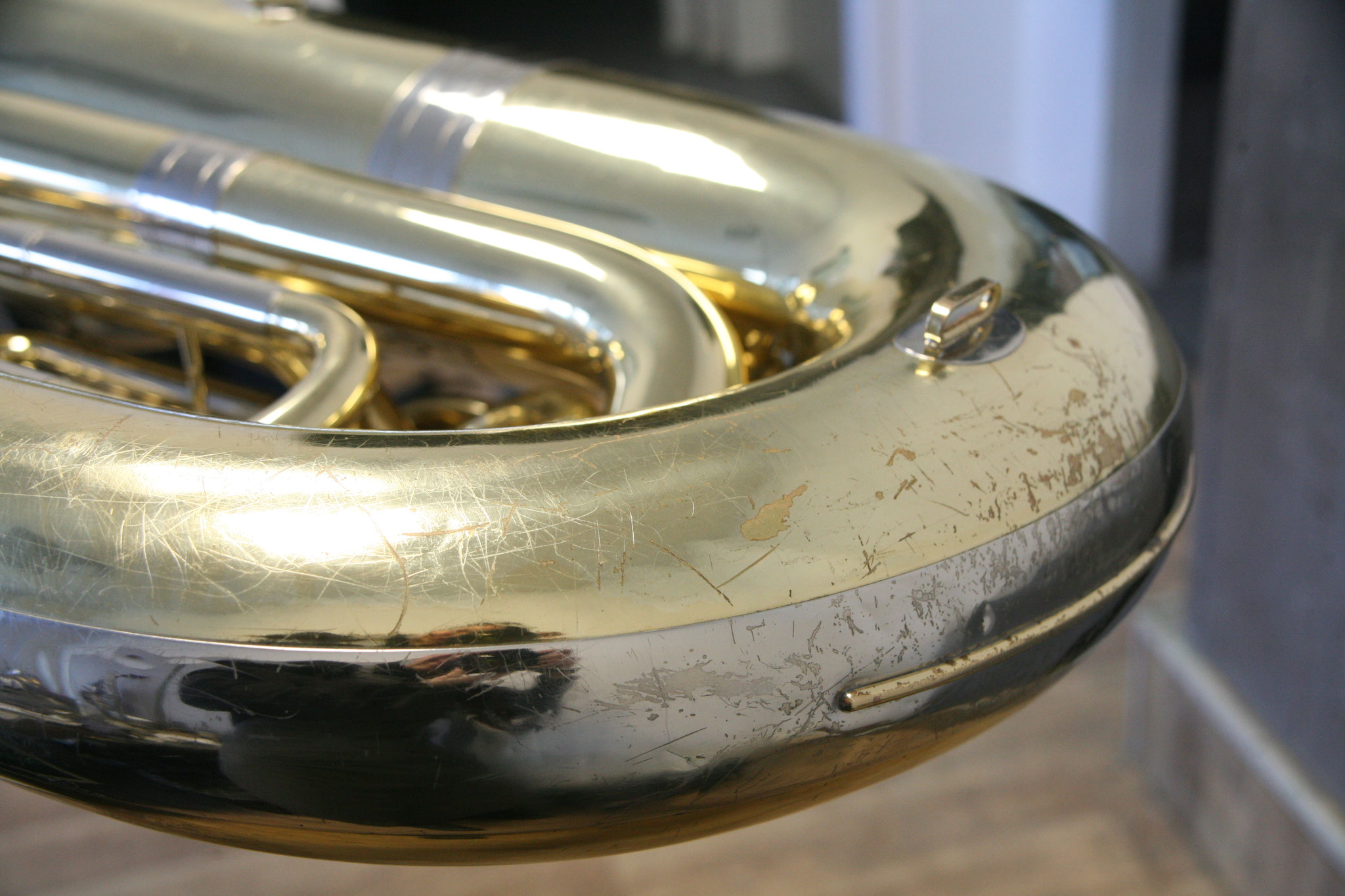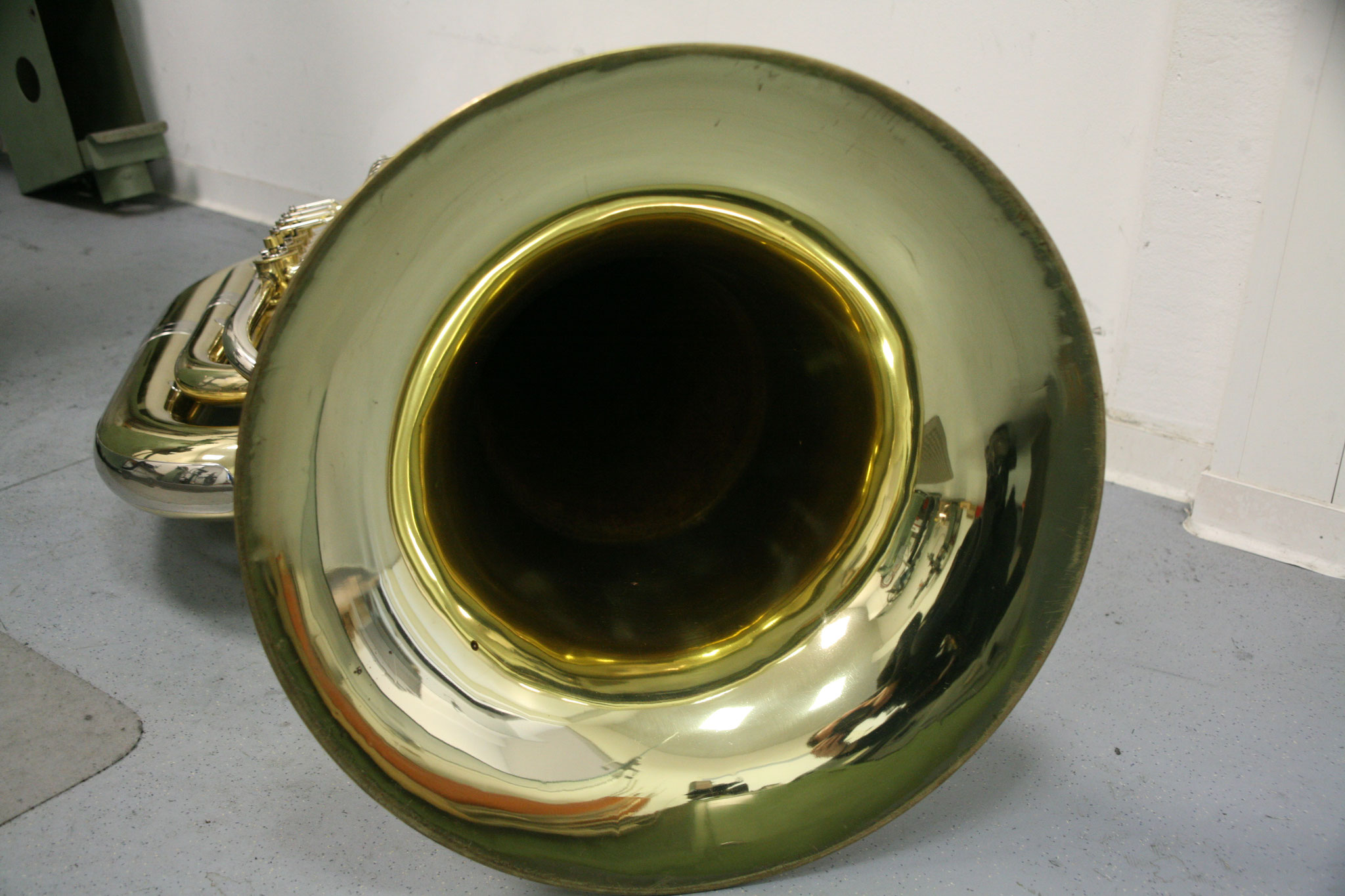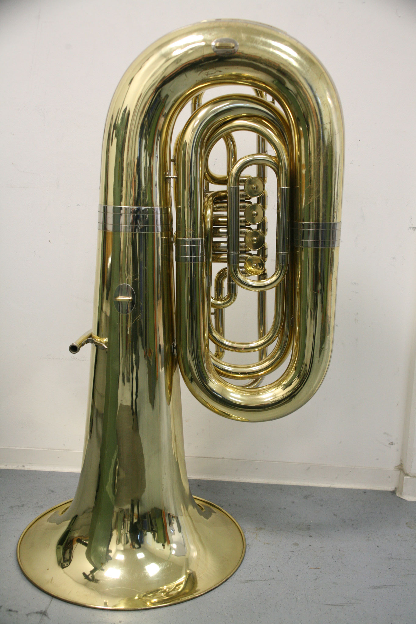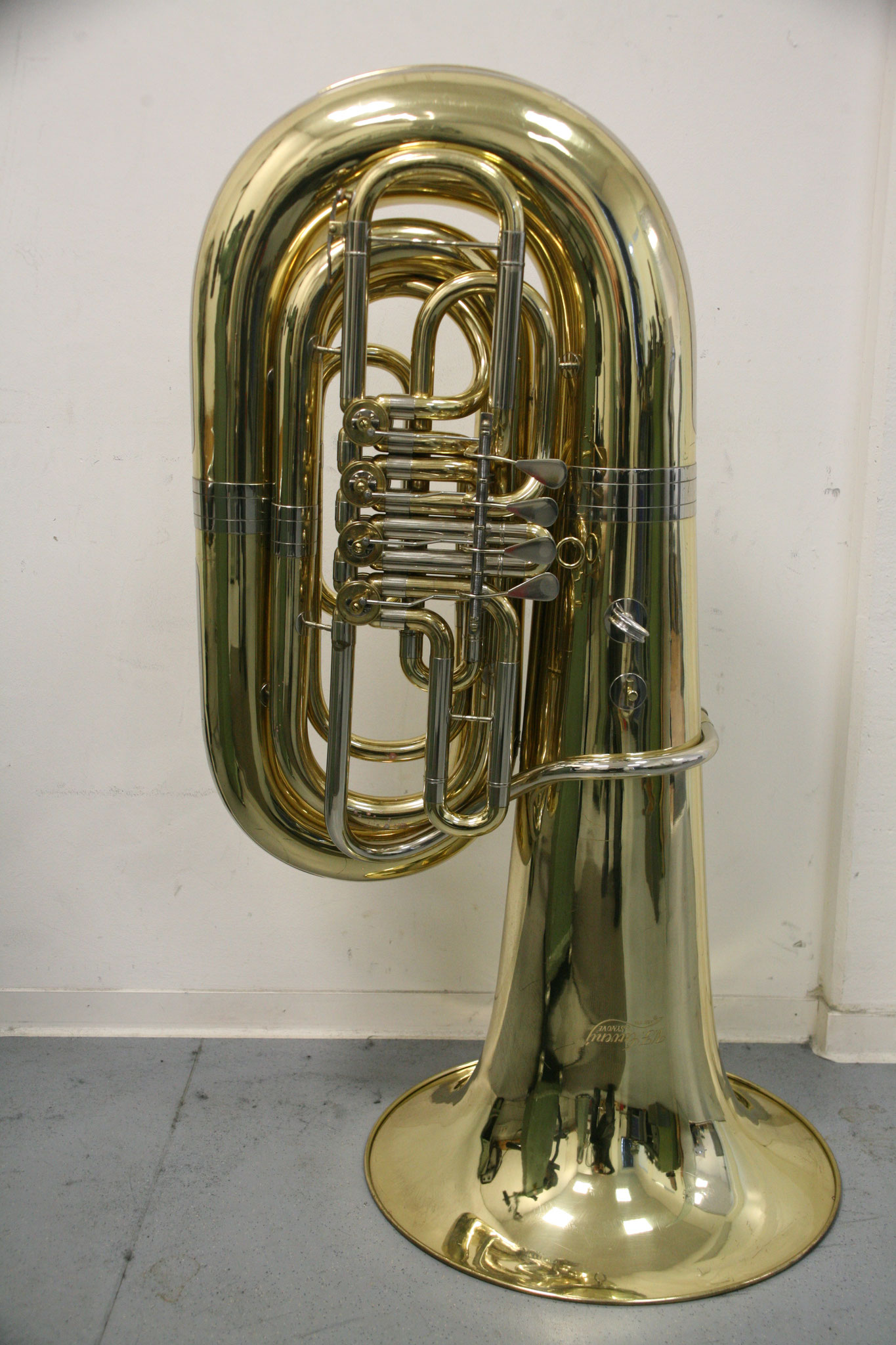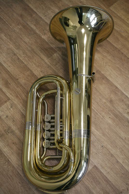 Ausstattung: Bohrung 21mm, Schalldurchmesser 50cm, Korpus Messing, Züge Neusilber, 4Ventilig – Mechanik doppel Minibal, Soundline Gig Bag. Die Tuba weist sichtbare Lackschäden und Zinkfrasspunkte auf (siehe Fotos). Abgesehen von diesen Stellen, glänzt die Tuba, insgesamt mit einem sehr guten Erscheinungsbild.