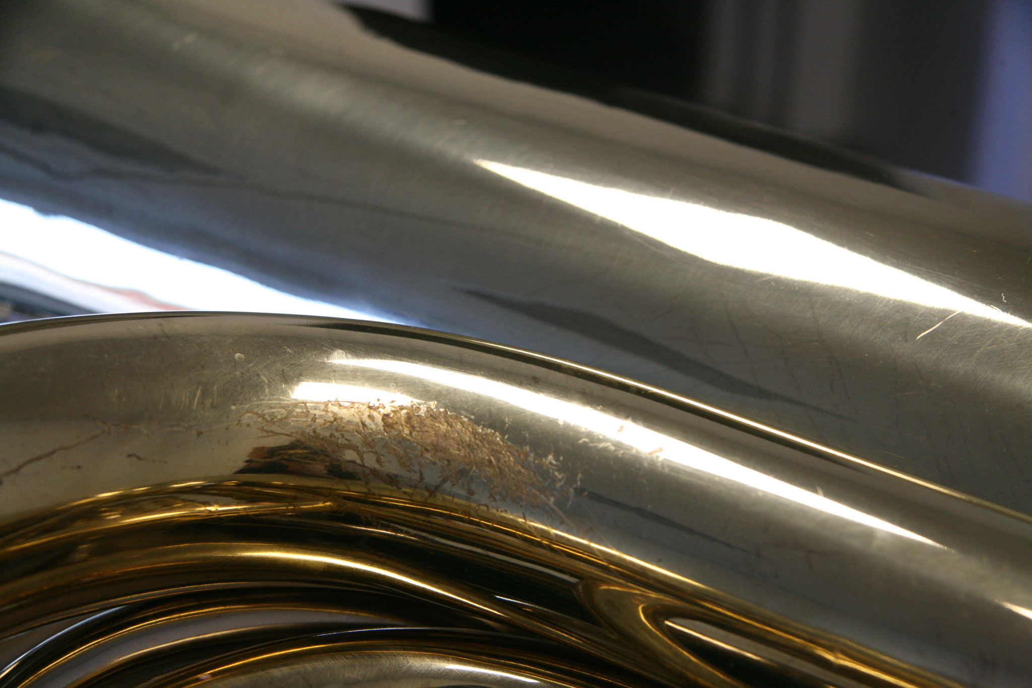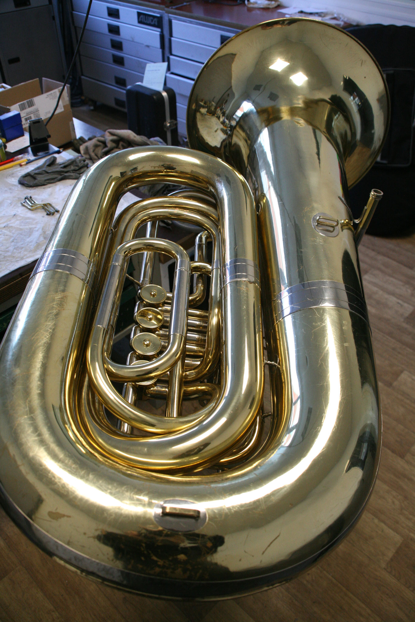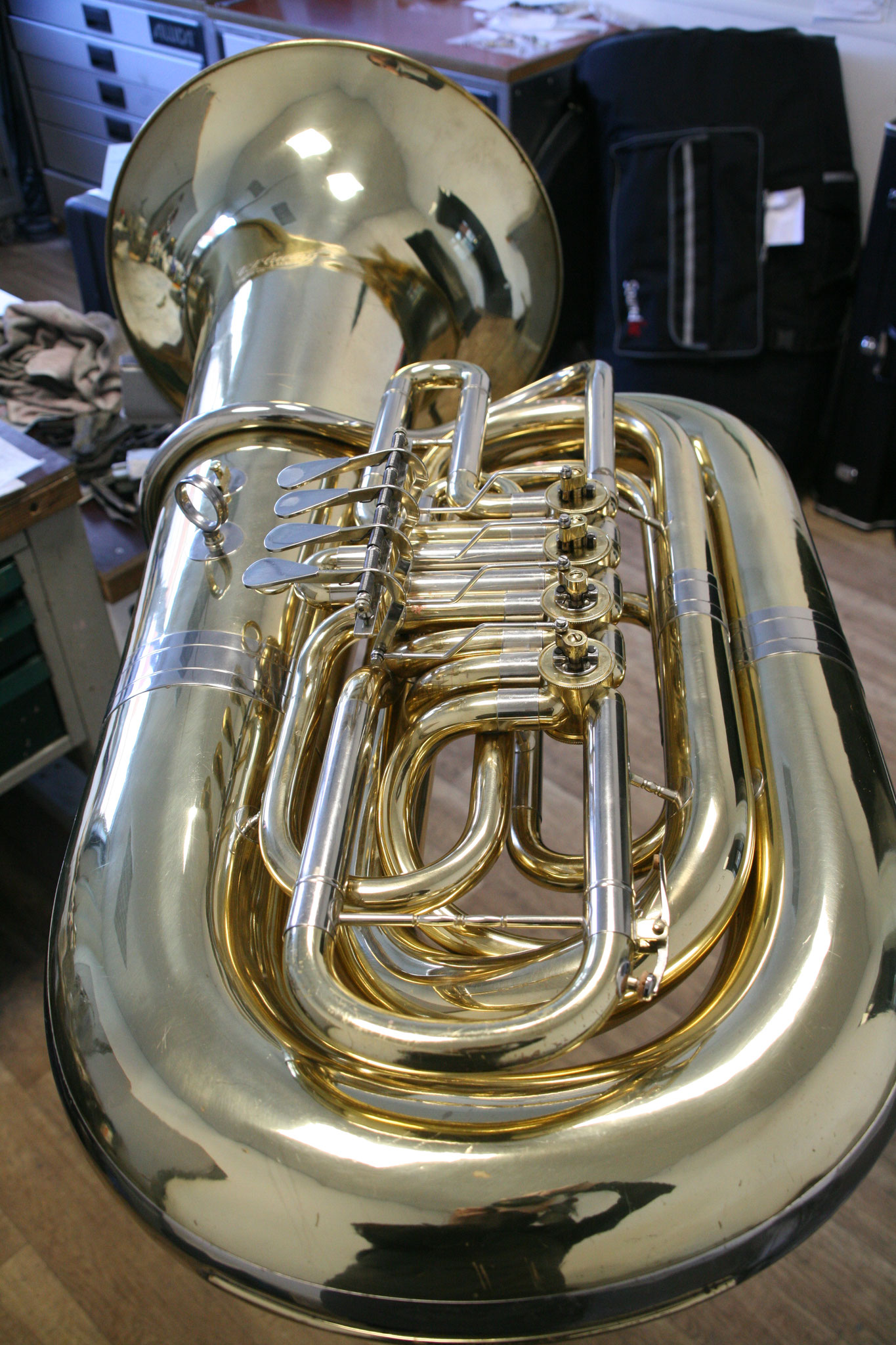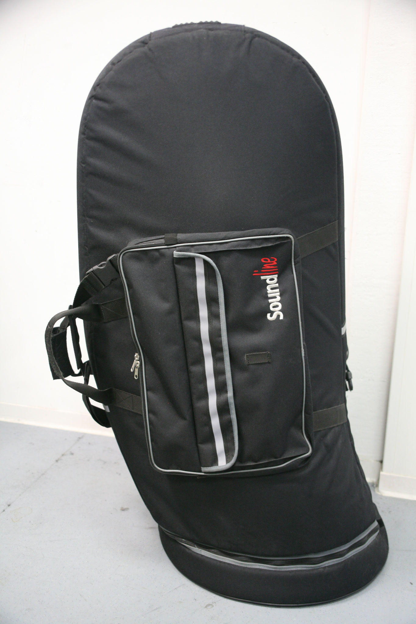 Ausstattung: Bohrung 21mm, Schalldurchmesser 50cm, Korpus Messing, Züge Neusilber, 4Ventilig – Mechanik doppel Minibal, Soundline Gig Bag. Die Tuba weist sichtbare Lackschäden und Zinkfrasspunkte auf (siehe Fotos). Abgesehen von diesen Stellen, glänzt die Tuba, insgesamt mit einem sehr guten Erscheinungsbild.